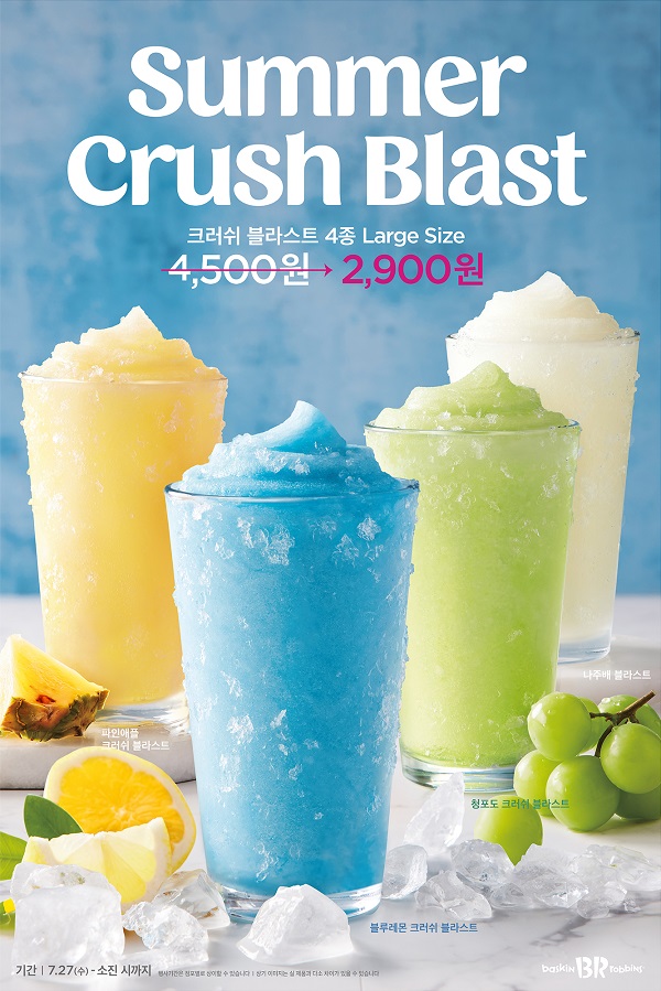 한편, 배스킨라빈스는 신제품 출시를 기념해 프로모션을 진행한다. 오는 27일부터 ‘썸머 크러쉬 블라스트’ 4종 라지 사이즈(4,500원) 구매 시 1,600원 혜택을 적용해 2,900원에 만나볼 수 있다.