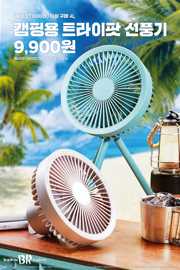 SPC그룹이 운영하는 배스킨라빈스가 여름철 야외 활동을 한층 시원하고 쾌적하게 만들어 줄 ‘캠핑용 트라이팟 선풍기’를 출시한다고 4일 밝혔다.