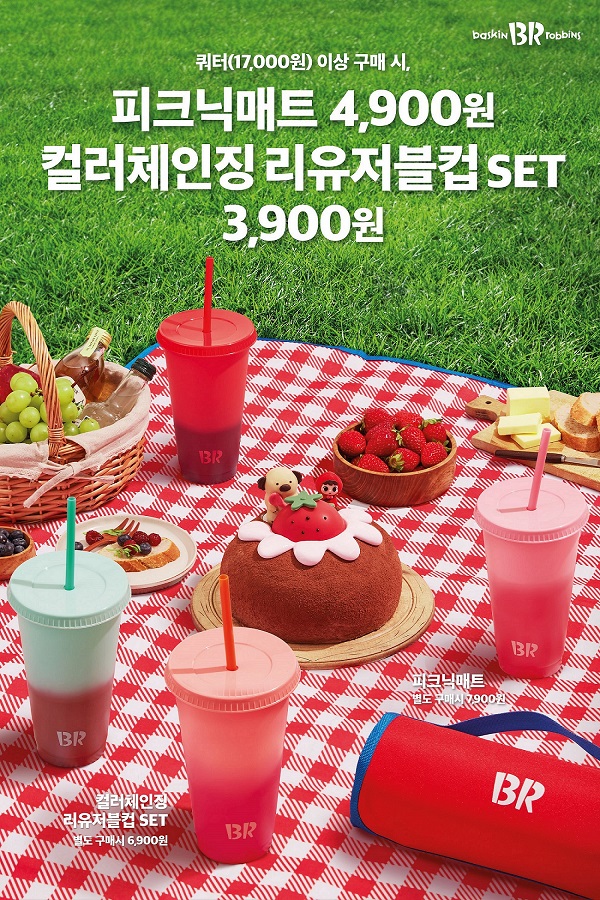 이번에 선보이는 굿즈는 ‘사랑에 빠진 외계인 피크닉 매트’, ‘컬러체인징 리유저블 컵 세트’ 등 2종이다. ‘사랑에 빠진 외계인 피크닉 매트’는 4월 이달의 맛과 함께 탄생한 캐릭터 ‘딸기 소녀’를 연상케 하는 붉은색과 하얀색 조합의 체크무늬 디자인으로 봄의 감성을 표현했다. 또한, 4인이 이용할 수 있는 넉넉한 사이즈를 자랑하며, 별도의 파우치 없이 휴대할 수 있는 일체형 매트로 편의성을 더해 피크닉 준비를 하는 소비자들에게 제격이다.