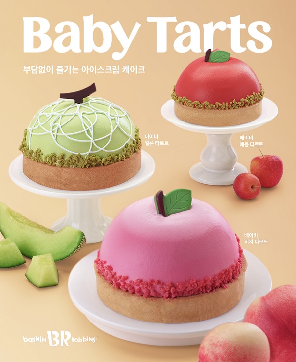 이에 배스킨라빈스는 ‘베이비 타르트’ 3종(△애플 △멜론 △피치)을 출시했다. ‘베이비 타르트’는 바삭하고 고소한 아몬드 타르트 위에 과일 형태 아이스크림을 올린 배스킨라빈스만의 소형 아이스크림 케이크로, 적당한 크기에 인스타그래머블한 비주얼이 특징이다.
