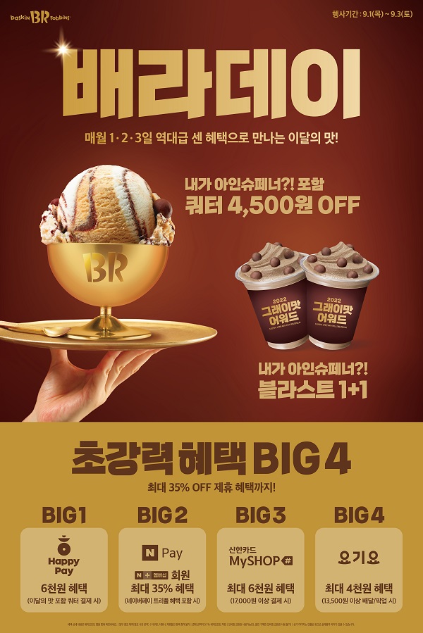 이번 ‘배라데이’는 총 52만명의 선택을 받아 ‘2022 아이스크림 콘테스트’ 우승작으로 선정 및 9월 이달의 맛으로 출시된 ‘내가 아인슈페너?!’를 대상으로 첫 혜택이 적용된다. ‘내가 아인슈페너?!’를 포함한 쿼터(17,000원, 4가지 맛) 사이즈 구매 시, 해피포인트 애플리케이션(앱) 바코드를 스캔 후 결제하면 4,500원의 혜택을 제공하며, ‘내가 아인슈페너?! 블라스트’는 1+1로 즐길 수 있다.