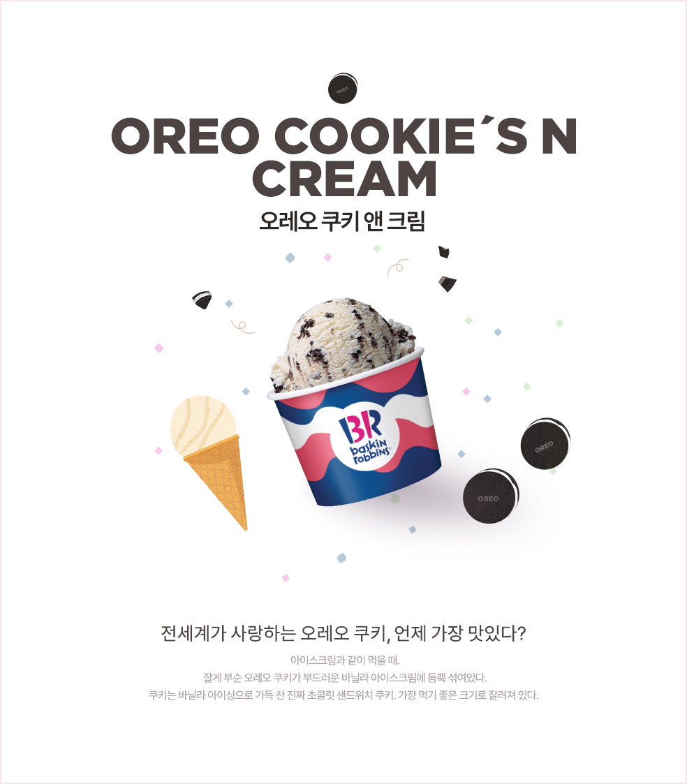 부드러운 바닐라향 아이스크림에, 달콤하고 진한 오레오 쿠키가 듬뿍!