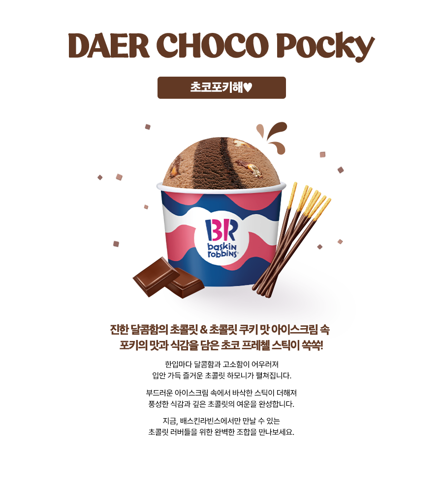 진한 달콤함의 초콜릿 & 초콜릿 쿠키 맛 아이스크림 속 포키의 맛과 식감을 담은 초코 프레첼 스틱이 쏙쏙!