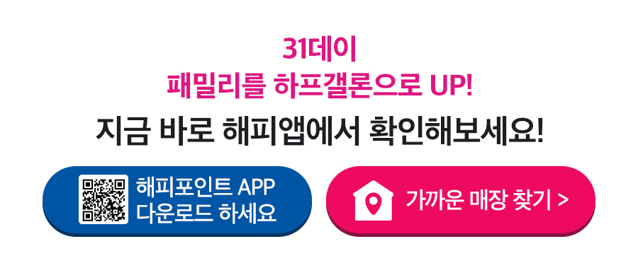 - 패밀리 > 하프갤론 사이즈업 혜택은 해피스테이션(무인주문기) 주문 시, 하프갤론 결제에 한하여 행사 참여 가능(패밀리로 결제 시 참여 불가)