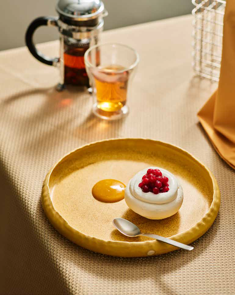 산미와 달콤함이 매력적인 야쿠르트 샤베트를 바삭한 머랭 속에 넣고, 제철 과일도 곁들여 복잡하면서도