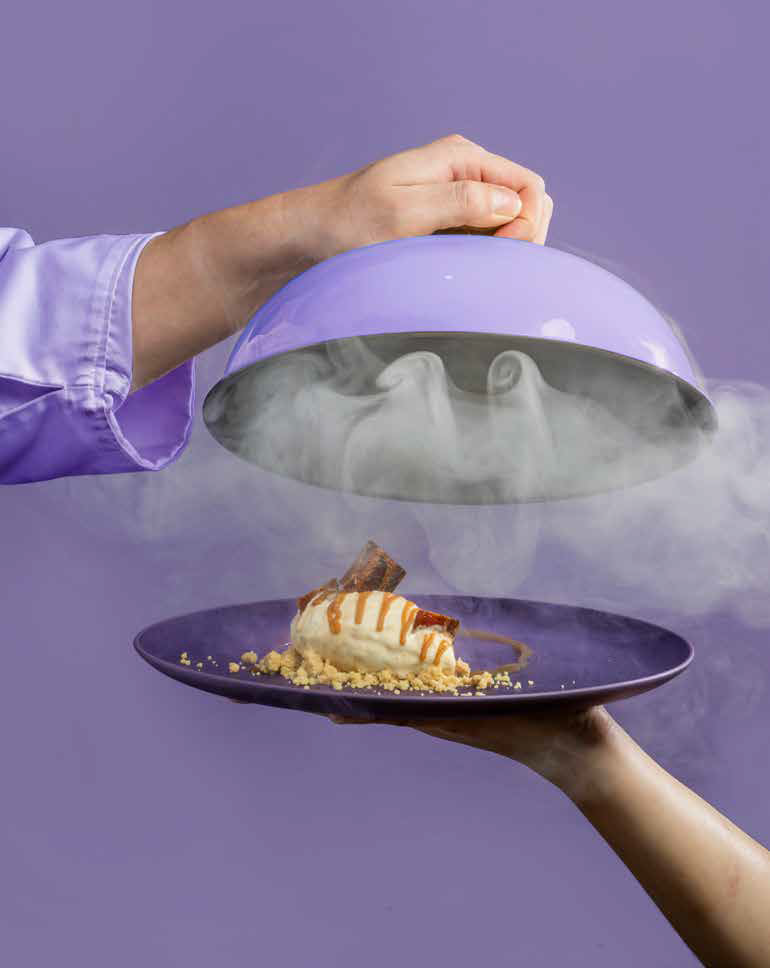 - 8접시에 헤이즐넛 크럼블을 깐 뒤, 카라멜 리본을 퀴넬 모양으로 올린다. 그 위에 차콜 플레이버 카라멜을 뿌리고, 마지막으로 캔디드 베이컨을 울려준다.
