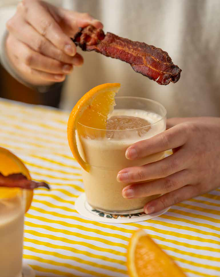 - 3완성된 ②의 음료를 잔에 담은 뒤 준비한 베이컨 조각과 오렌지 조각을 얹어준다.