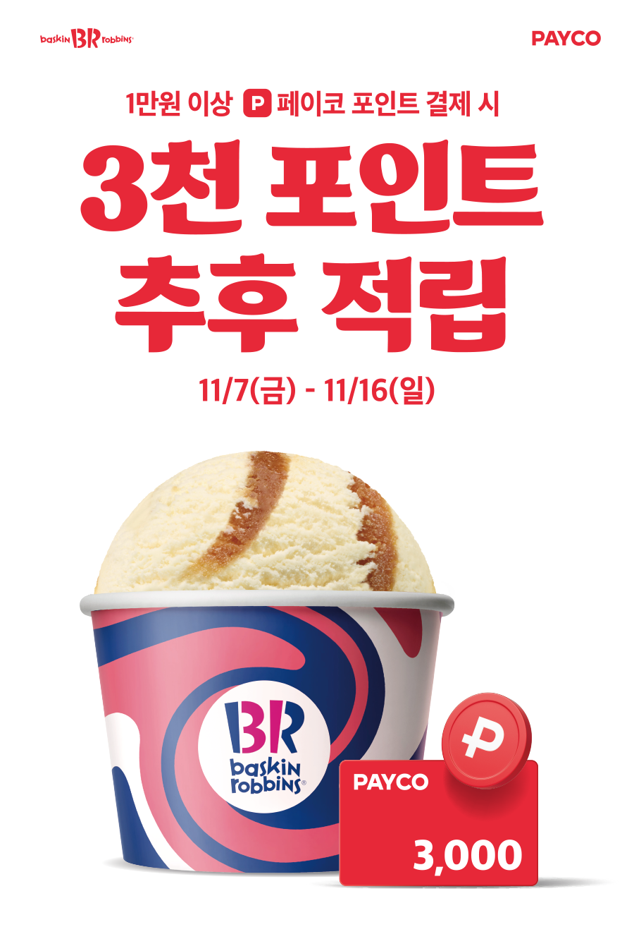 - 본 이벤트는 배스킨라빈스와 NHN PAYCO사정에 의해 사전 고지 없이 변동 및 종료될 수 있습니다.