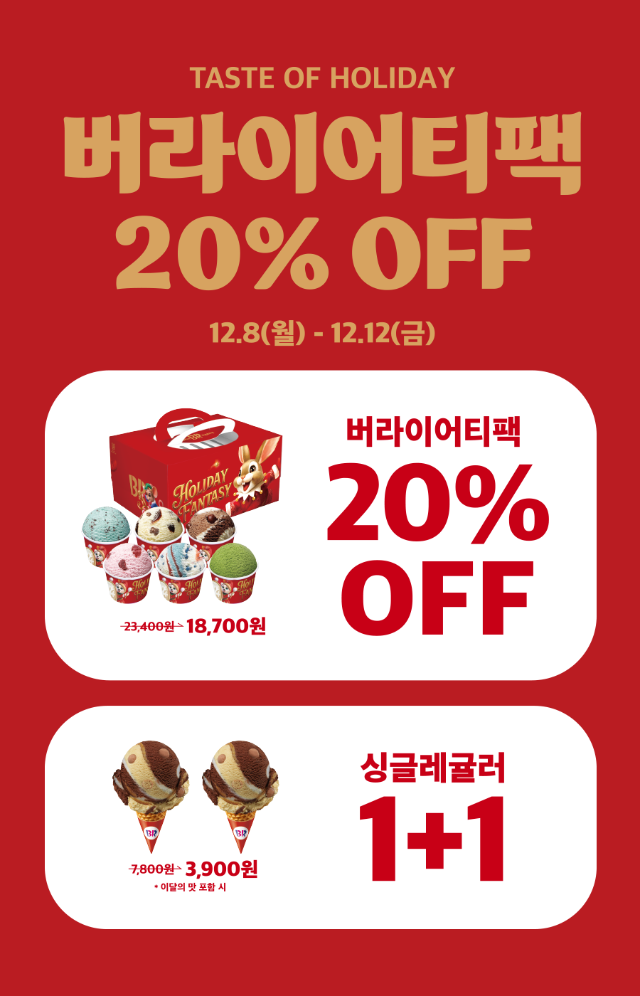 - [싱글레귤러 1+1] 12월 이달의 맛 '초콜릿 쿠키 스모어' 포함 싱글레귤러 구매 시 1+1 적용 가능